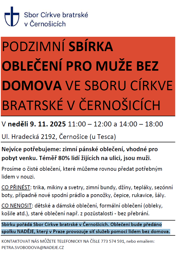 Sbírku pořádá Sbor Církve bratrské v Černošicích. Oblečení bude předáno spolku NADĚJE, který v Praze provozuje síť služeb pomoci lidem bez domova.