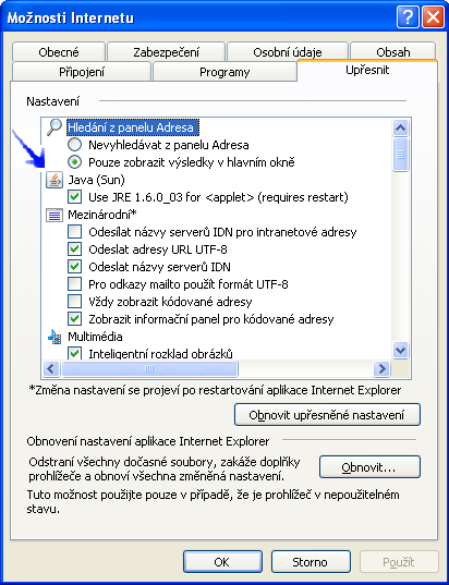 - nastavení v Internet Exploreru: Volba, Nástroje, Možnosti Internetu, Upřesnit, Java (Sun) - Nastavení v IE