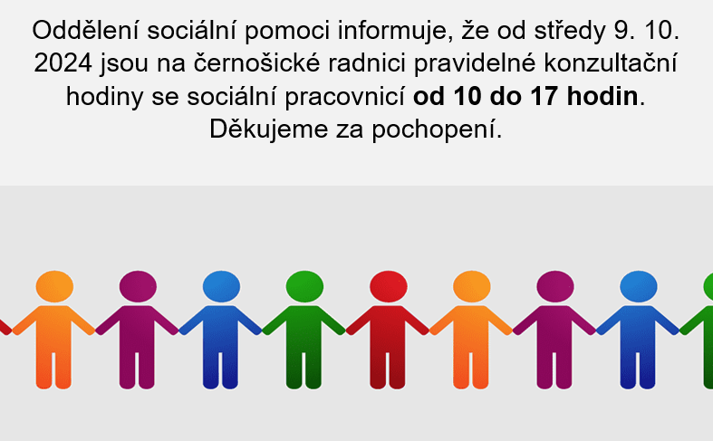 Oddělení sociální pomoci informuje, že od středy 9. 10. začínají pravidelné konzultační úřední hodiny v Černošicích v 10 hodin. Sociální pracovnice bude v kanceláři na černošické radnici přítomna každou středu od 10 do 17 hodin.